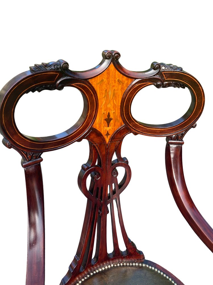 Superbe paire de fauteuils Anglais en acajou et palissandre mouluré et sculpté, marqueterie sur fond de citronnier.